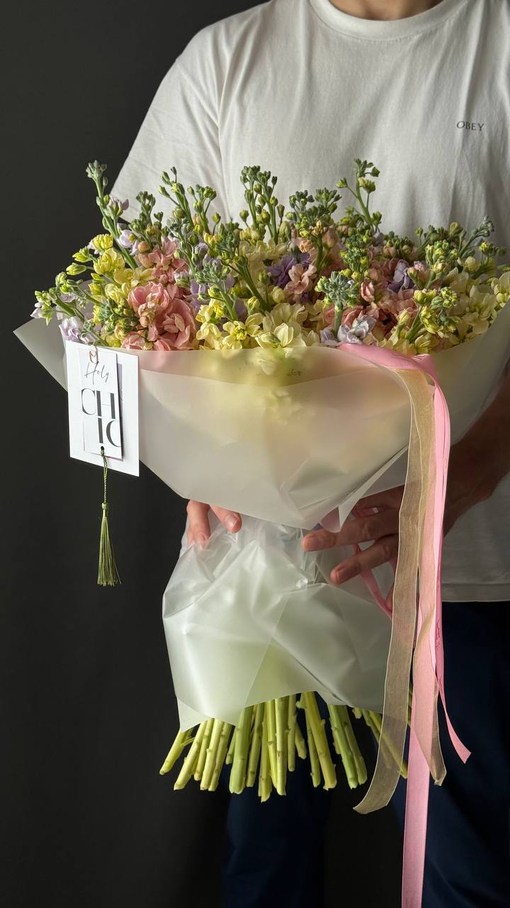 When selecting a bouquet, we consider its size, color palette, and approximate composition. Please note that the flower selection may vary slightly from what is shown in the photo, depending on availability and seasonality. However, our team will do their best to ensure the bouquet's mood and overall feel remain exactly as you selected.