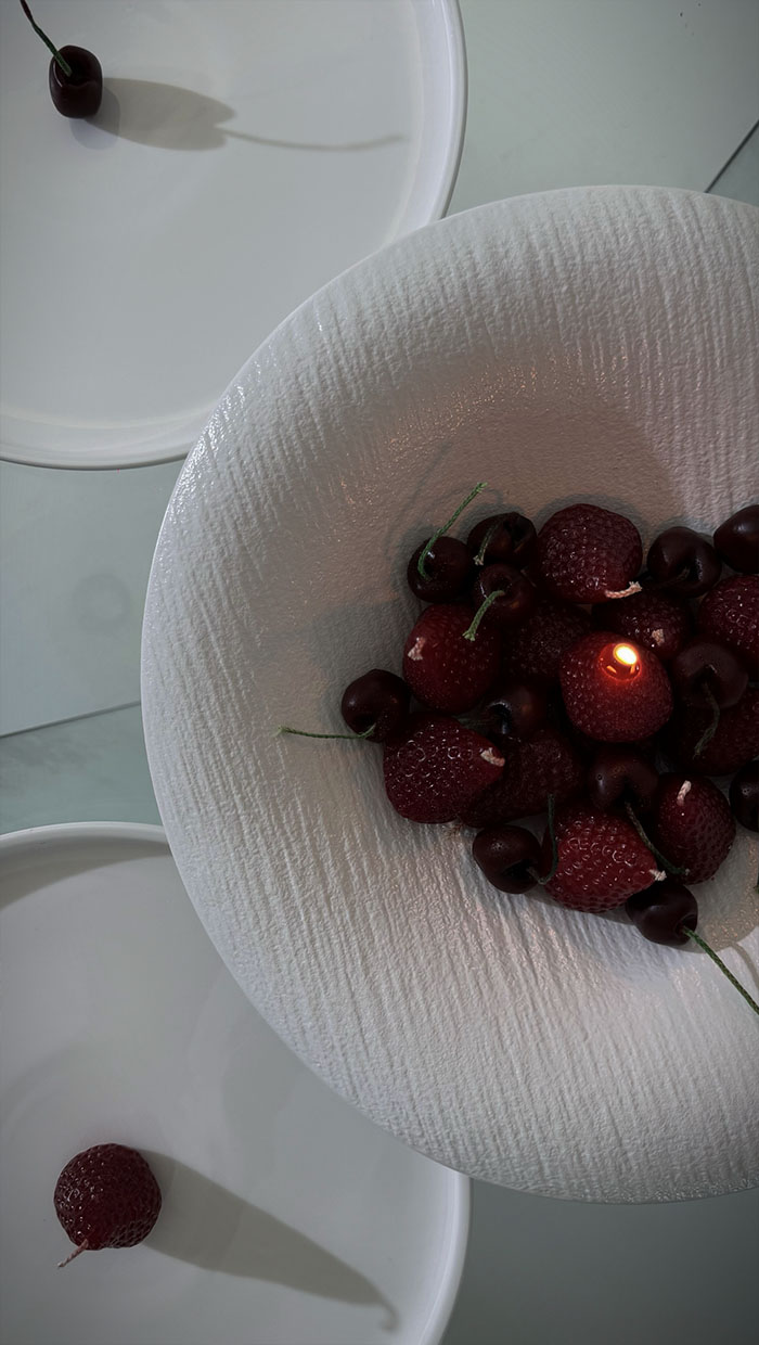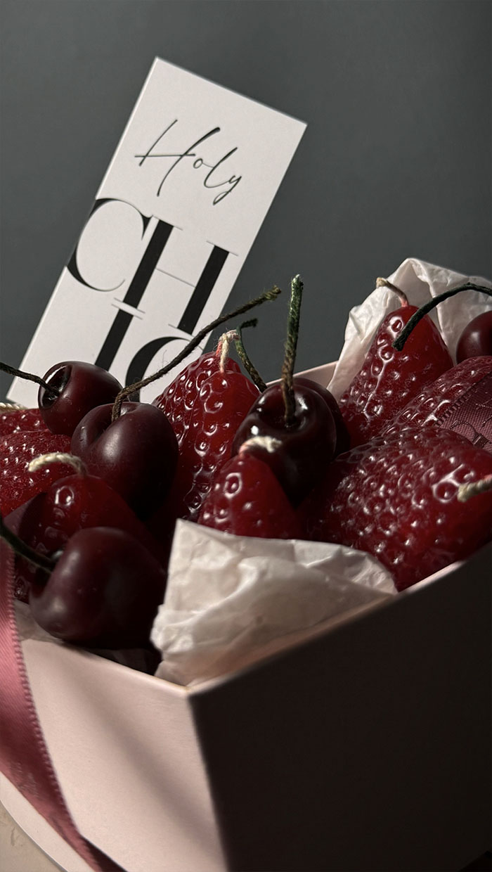 A gift set of realistic, handcrafted scented candles inspired by berries strawberry and cherry - perfect for decorating a romantic date and creating a cozy, intimate atmosphere.